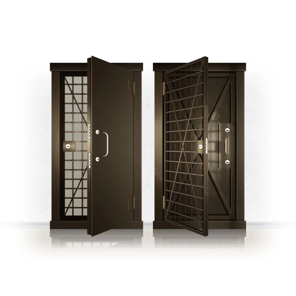 Металлические двери КХО и КХН представляют собой входные блоки, обладающие высоким уровнем взломостойкости и состоят из трех основных элементов: усиленного каркаса, сплошного металлического полотна и решетчатой двери. Дверной блок изготавливается из стального уголка 100*100 мм. Места крепления блока к стене цементируются и закрываются стальными наличниками шириной 40 мм. Крепеж заходит вглубь стены на 80 мм. В конструкции внешней створки монтируются ребра жесткости, для обшивки используется сталь толщиной не менее 3 мм. Внутренняя решетка изготавливается из прутка диаметром 16 мм. Размер ячеек решетки должен составлять не более 15 на 15 см. В точках пересечения прутья надежно приваривают друг к другу. В КХО и КХН необходимо поддерживать определенную температуру и влажность. Для этого внутреннее пространство глухой двери заполняется теплоизоляционным материалом, а по периметру двери приклеивается уплотнитель. Такие двери оборудуются замками с повышенным уровнем взломостойкости. Специализированные двери КХО и КХН в Лаишево могут быть оснащены сигнализацией, в конструкции могут быть проушины для навесного замка и элементами для опечатывания. Если идет речь о двери в комнату хранения оружия, в створке оборудуется окно для выдачи оружия и спец. средств, которое накрывается стальной дверцей.