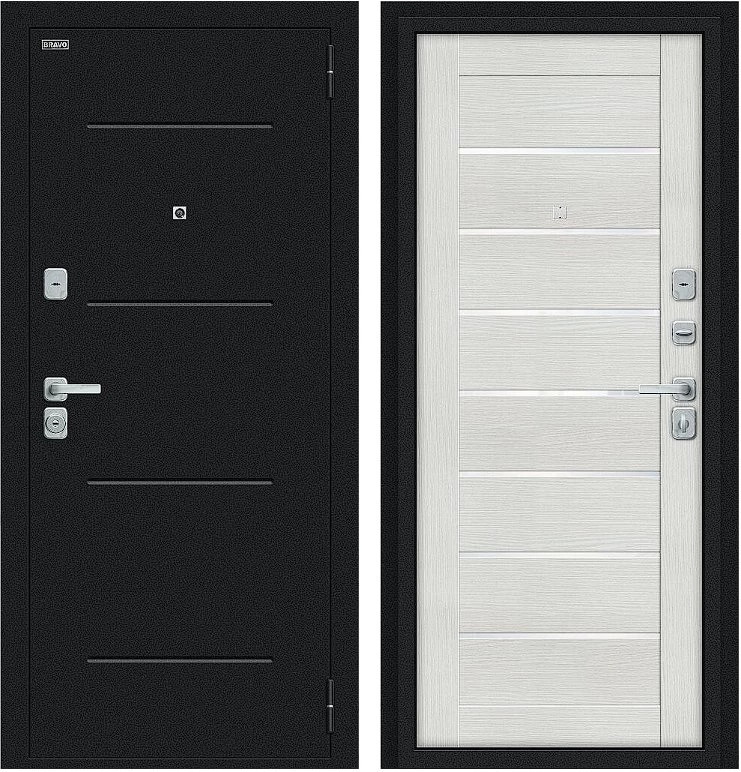 Надежная входная Дверь Браво Техно/BChrome Букле черное/Bianco Melinga премиум класса по цене 34 699 руб. Большая толщина стали защитит от проникновения в ваш дом, квартиру или коттедж. Используется очень качественная фурнитура: замки, цилиндры, ручки, защелки. Покрытие и отделка двери изготовлено под внимательным контролем производителя. Дверь имеет долгий срок службы и гарантию.